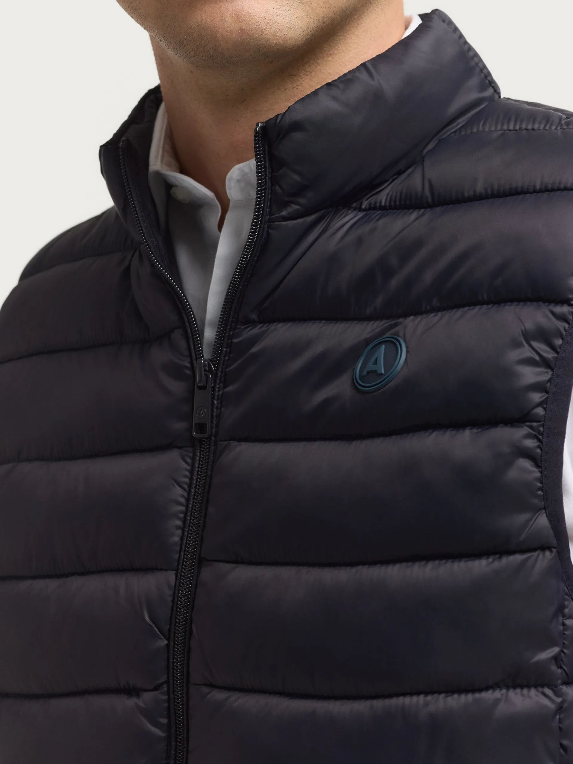 Chaleco acolchado con cuello subido. Dos bolsillo a la altura de la cintura, logo grabado en el frontal y sisa y cintura en punto elástico. Forro interior a contraste con bolsillos.