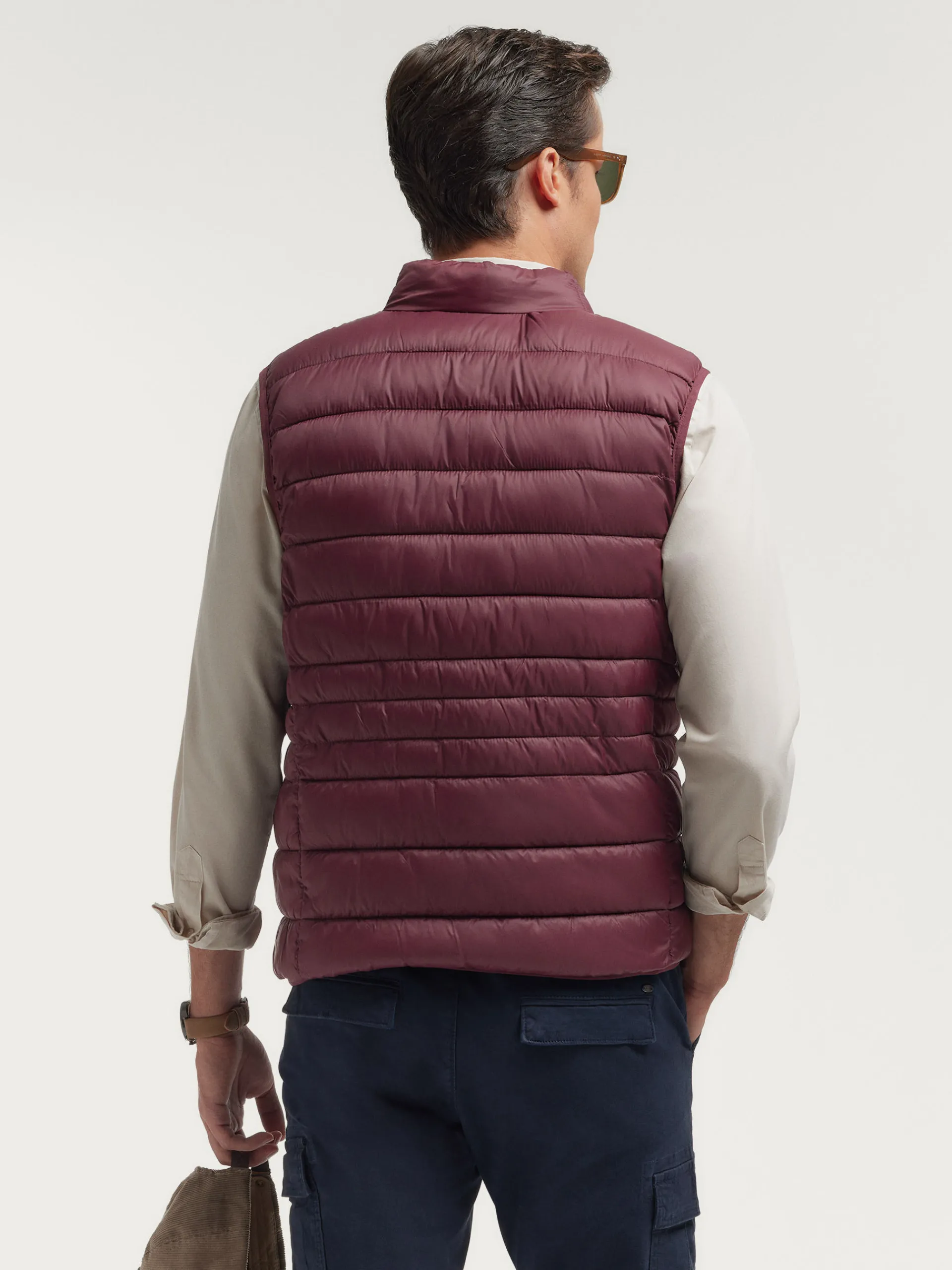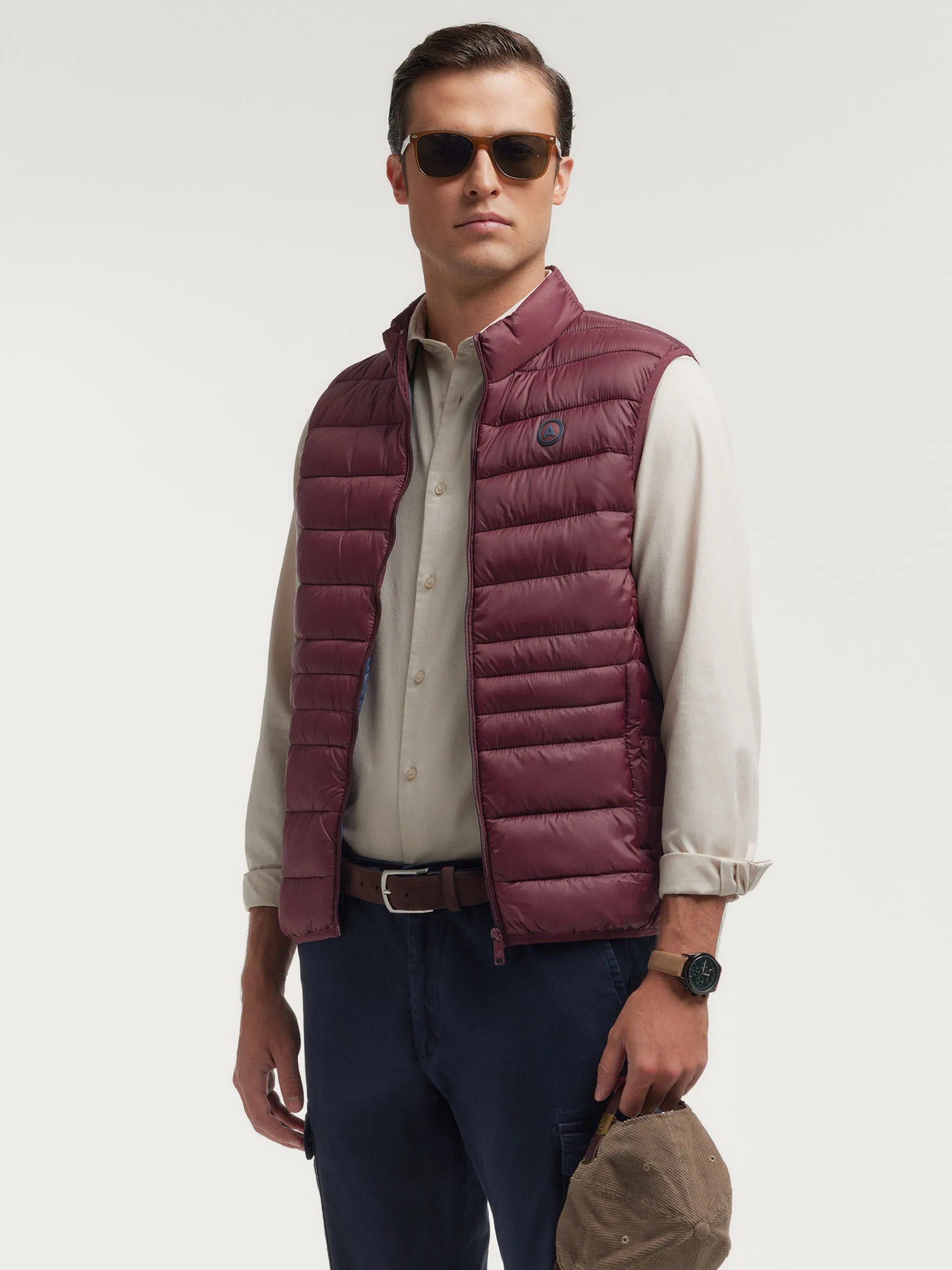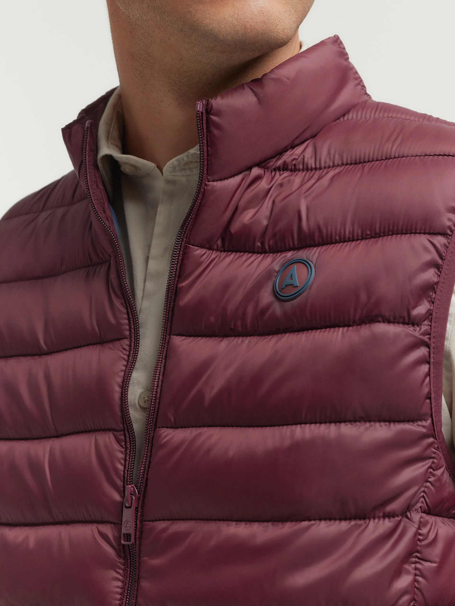 Chaleco acolchado con cuello subido. Dos bolsillo a la altura de la cintura, logo grabado en el frontal y sisa y cintura en punto elástico. Forro interior a contraste con bolsillos.