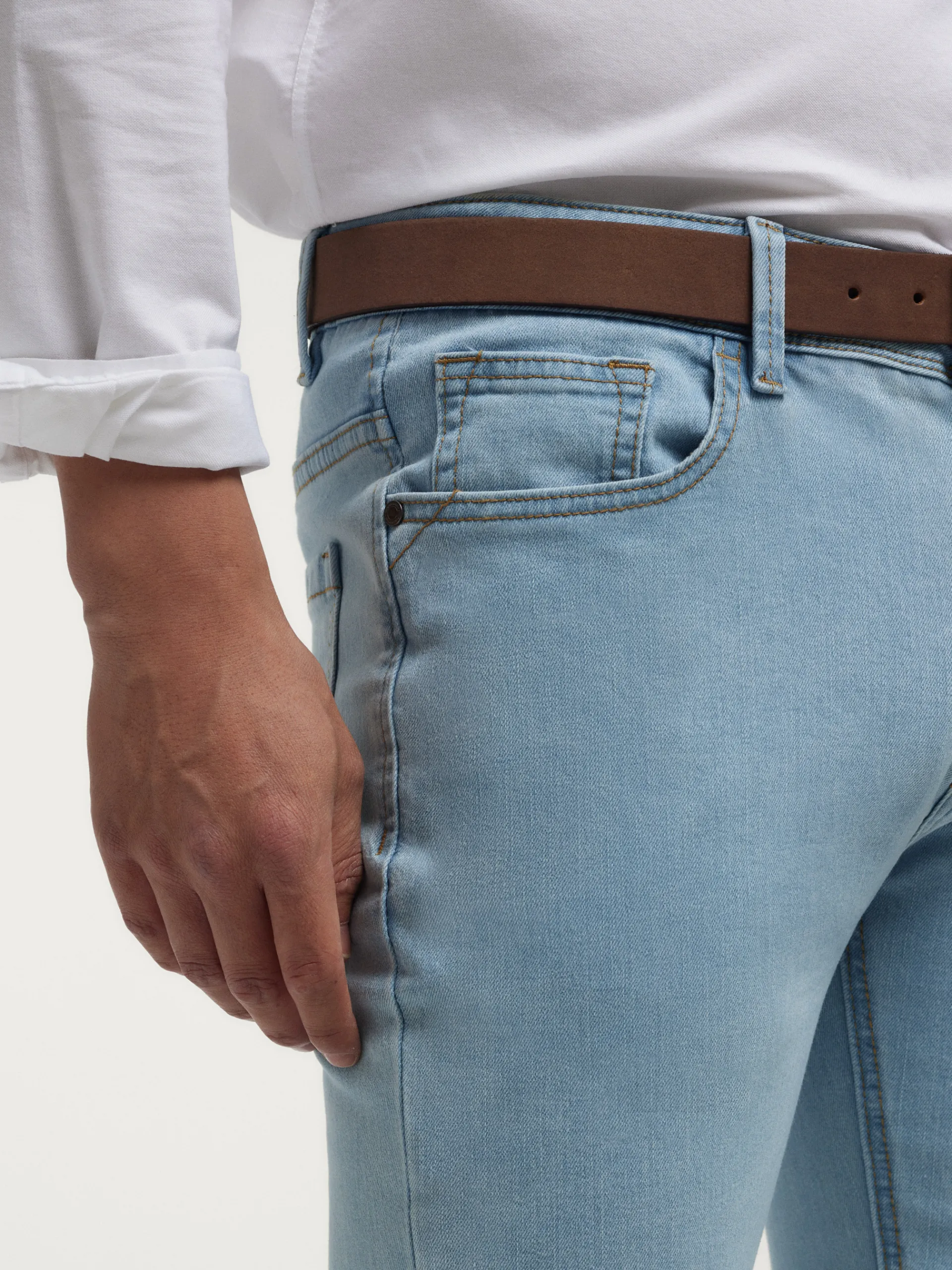 Pantalón denim de corte regular fit con cinco bolsillos y cierre central mediante botón y cremallera, pespuntes en color camel, fornituras personalizadas y etiqueta en efecto piel en la cinturilla.