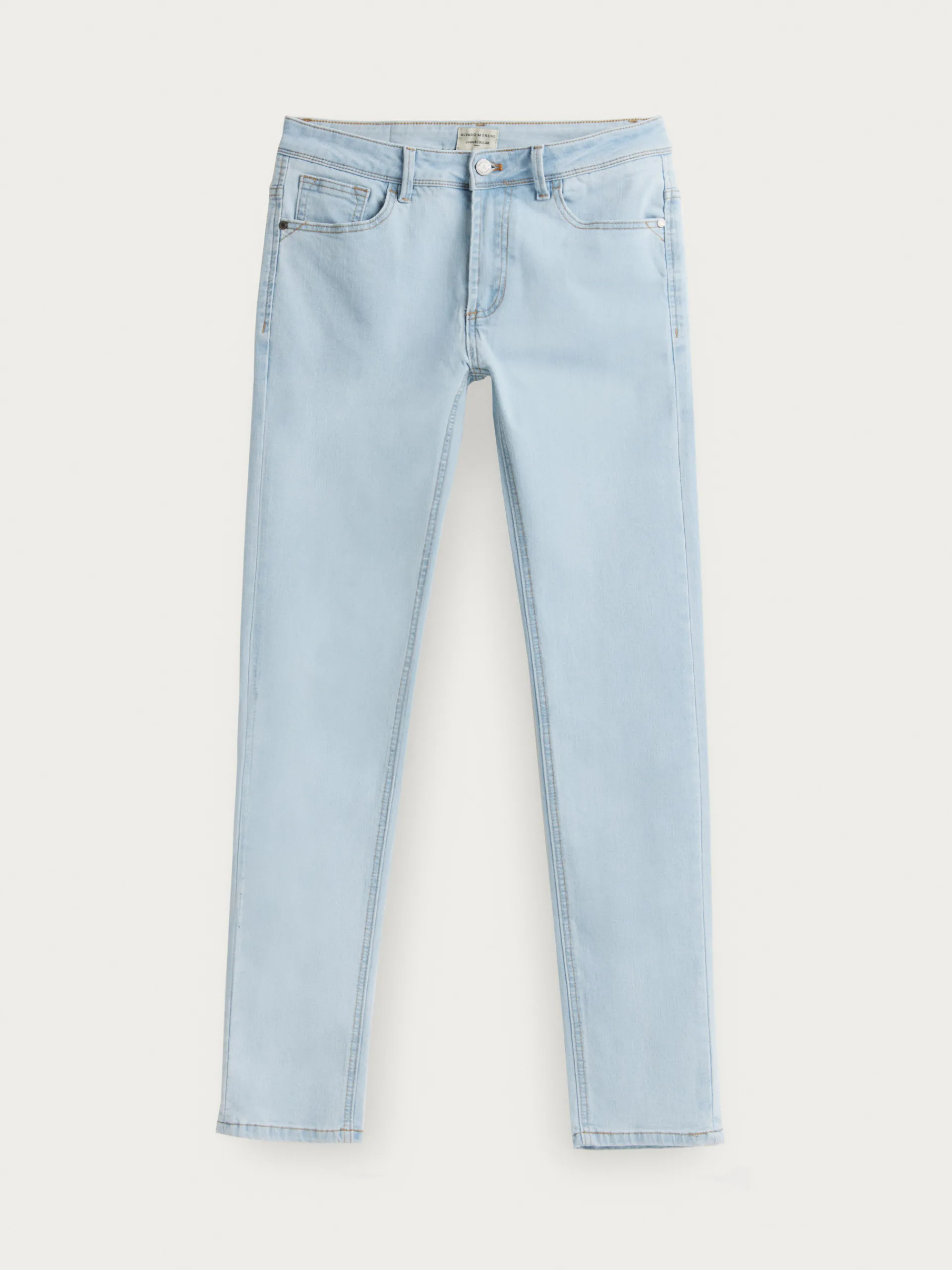 Pantalón denim de corte regular fit con cinco bolsillos y cierre central mediante botón y cremallera, pespuntes en col…