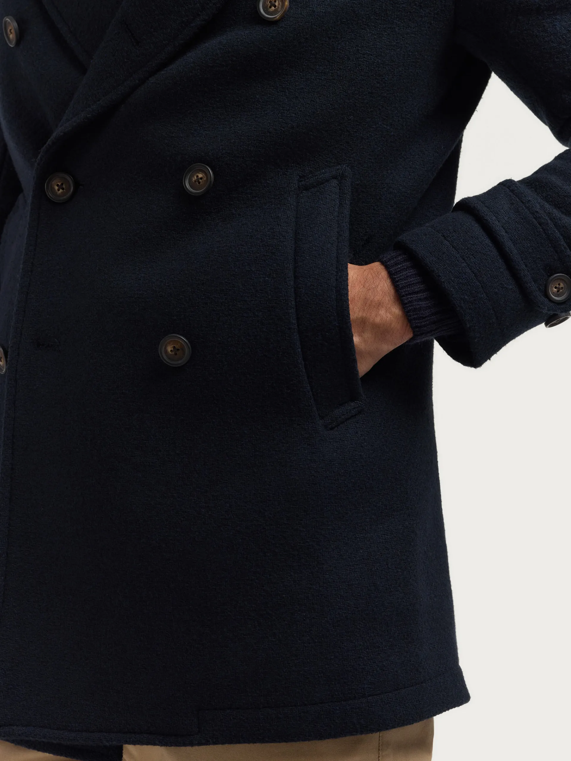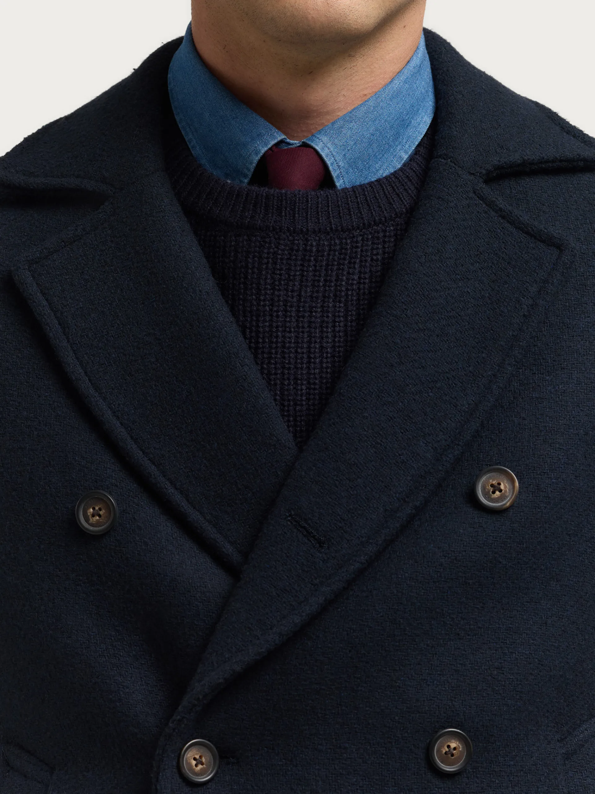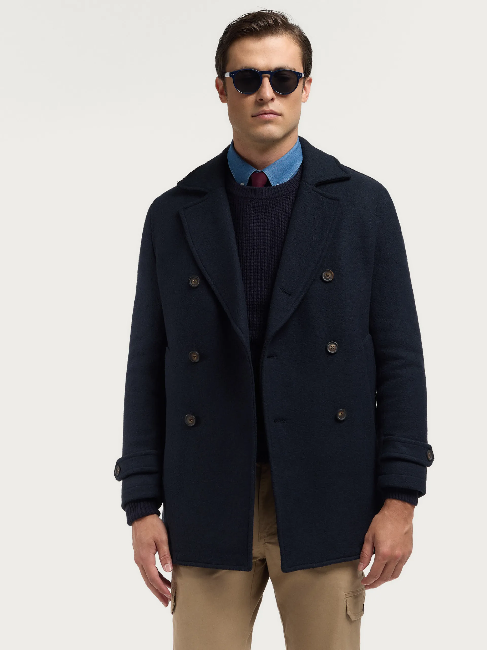 Abrigo de corte regular fit que cuenta con cuello y solapa, cierre central cruzado mediante botonadura en efecto madera y dos bolsillos en la cintura. Abertura en el centro de la espalda. Forrado en su interior con dos bolsillos.