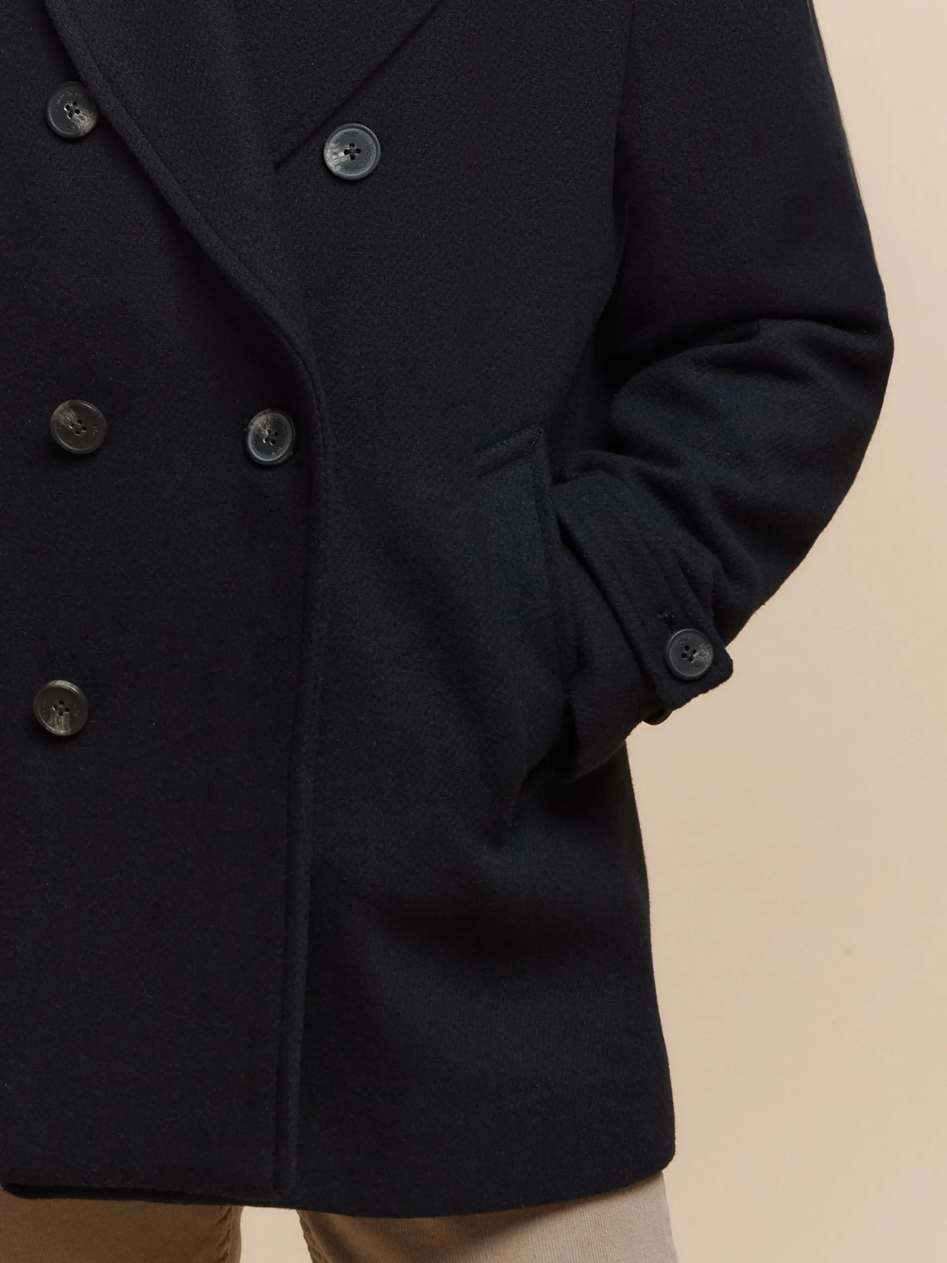 Abrigo de corte regular fit confeccionado en diferentes materiales de los cuales destaca la lana. Cuenta con cuello y solapa, cierre central cruzado, dos bolsillos en la cintura, abertura en el bajo de la espalda y detalle con dos botones en el puño de las mangas. Forrado en su interior con dos bolsillos.