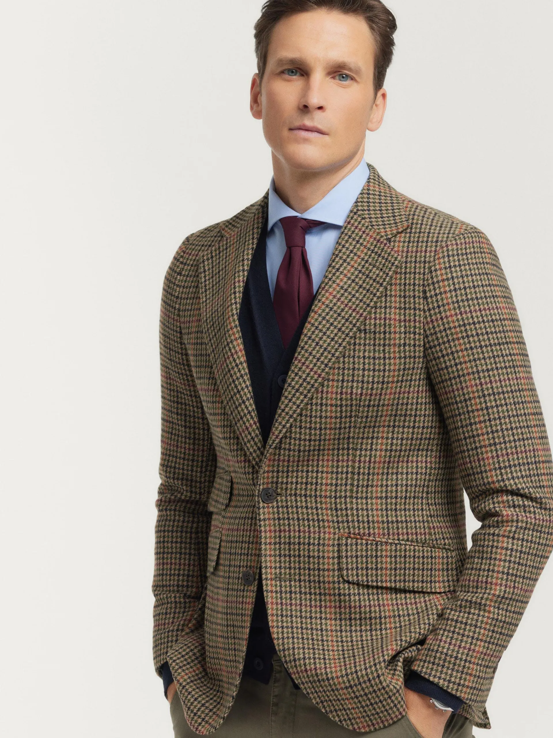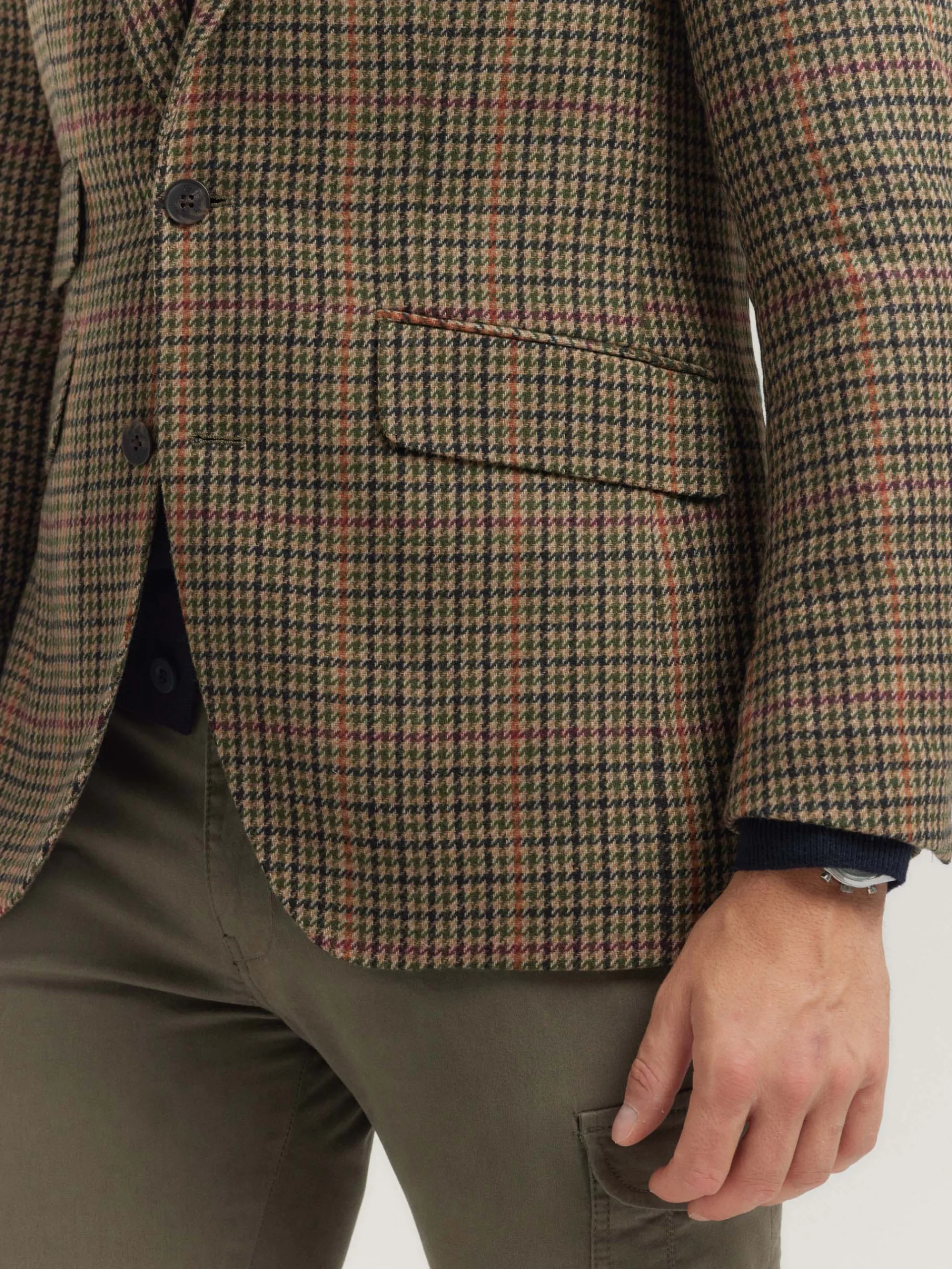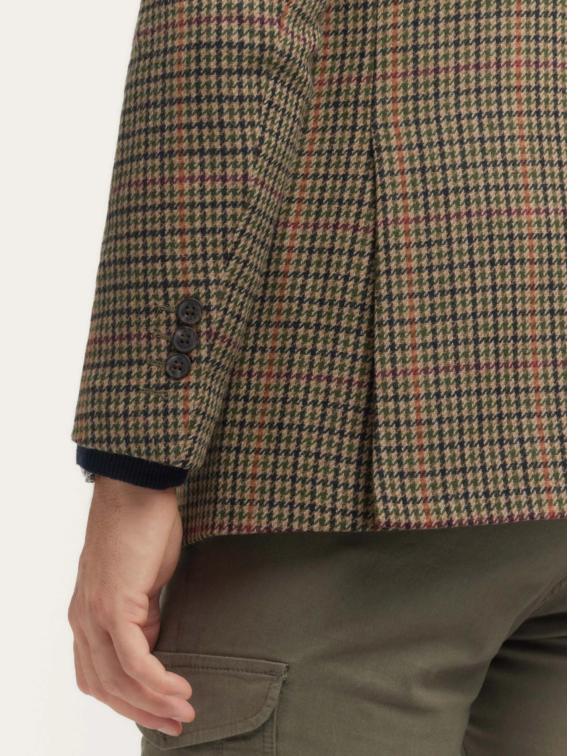 Americana confeccionada en tejido a cuadros de corte slim fit. Cuenta con cuello y solapa, cierre central simple mediant…
