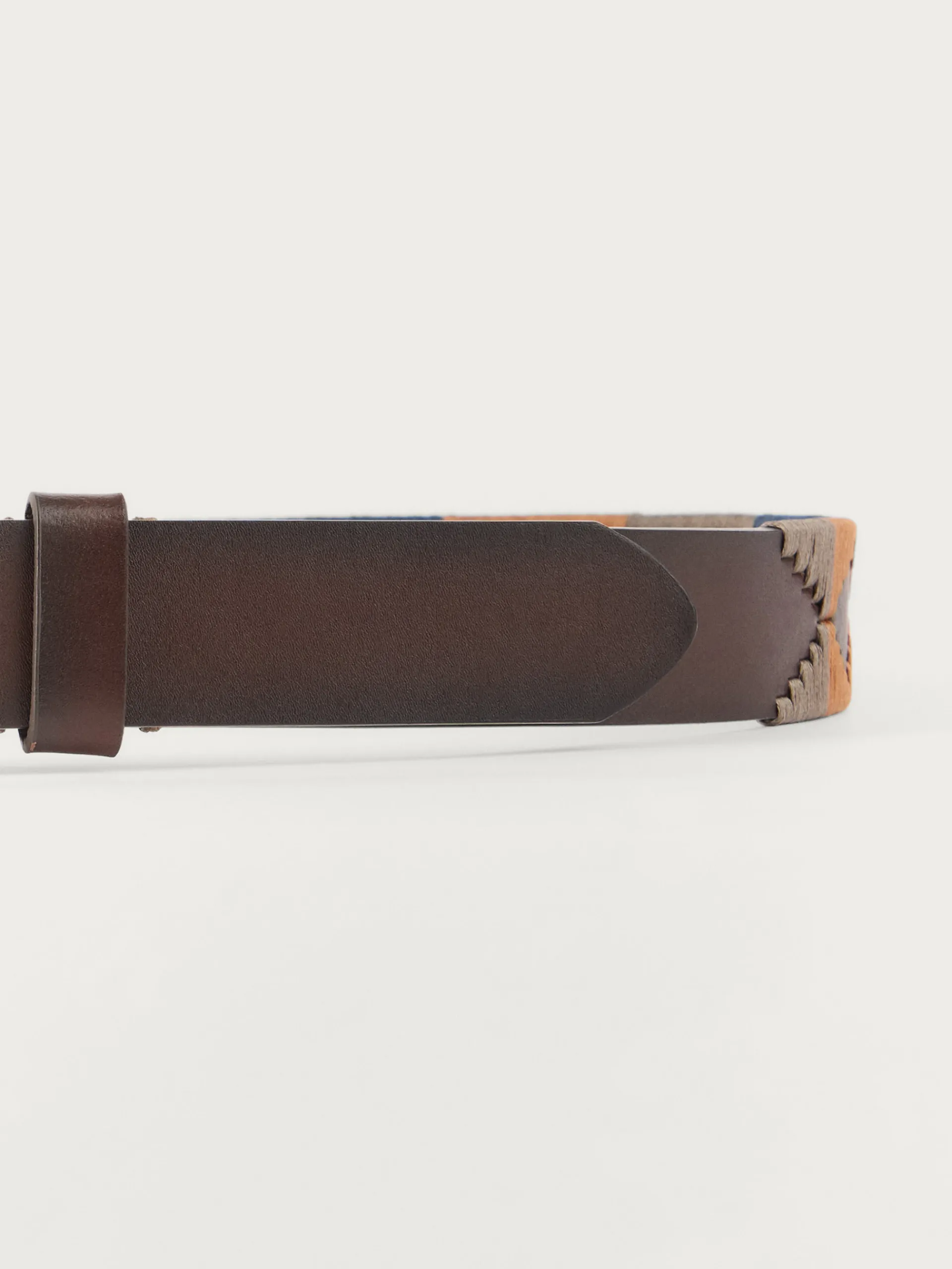 Cinturón con detalles personalizados a contraste y cierre central mediante hebilla metálica y pasador.