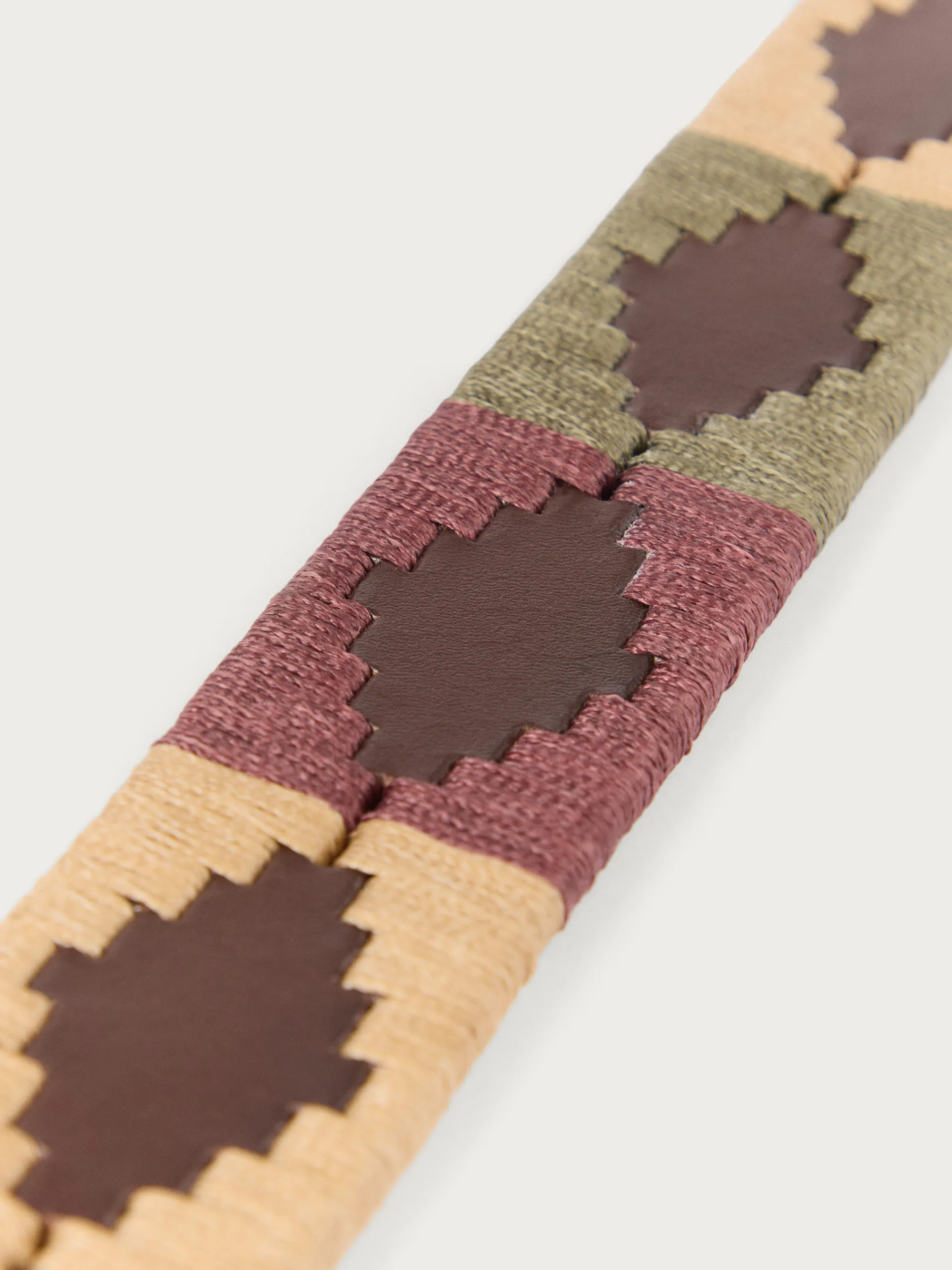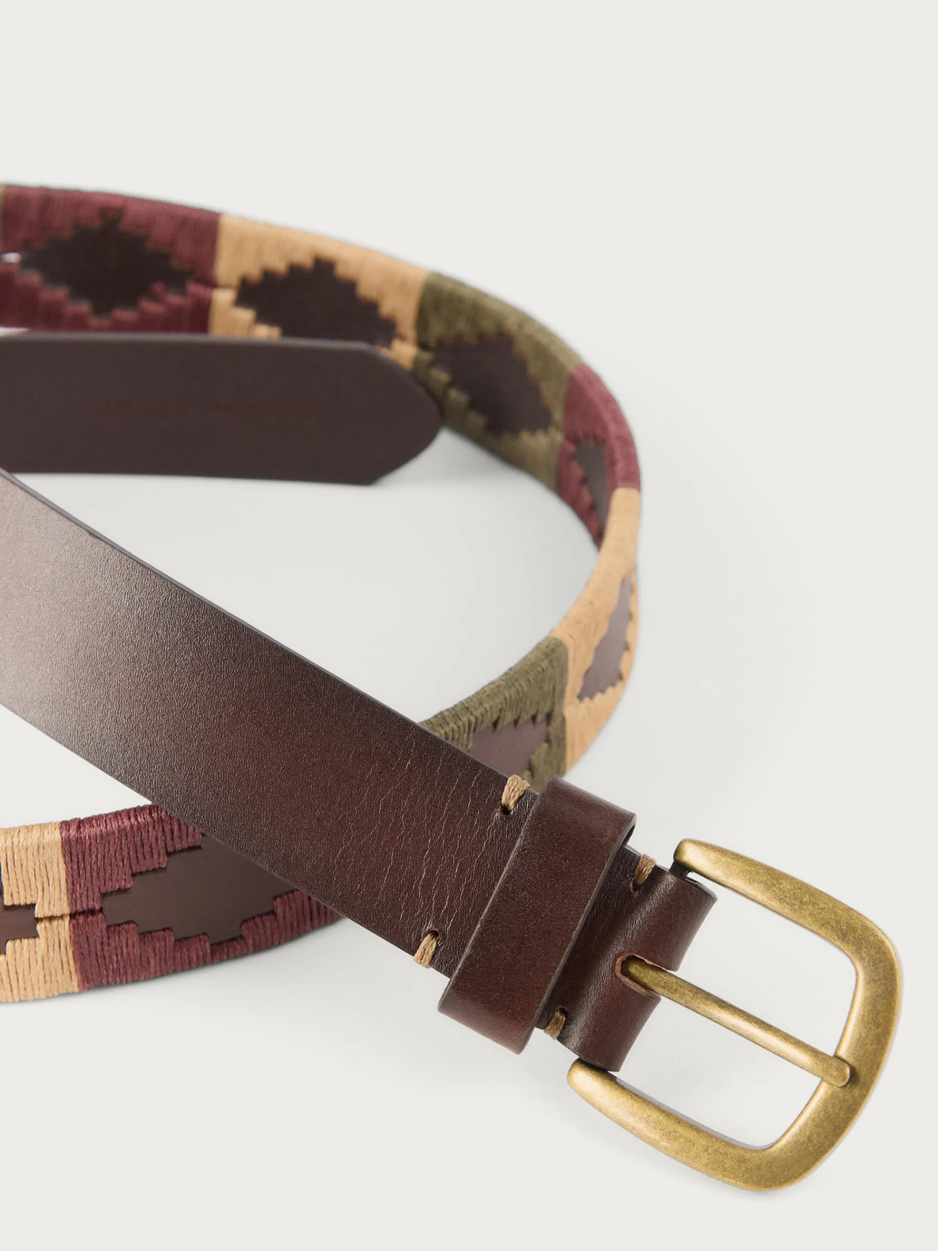 Cinturón con detalles personalizados a contraste y cierre central mediante hebilla metálica y pasador.
