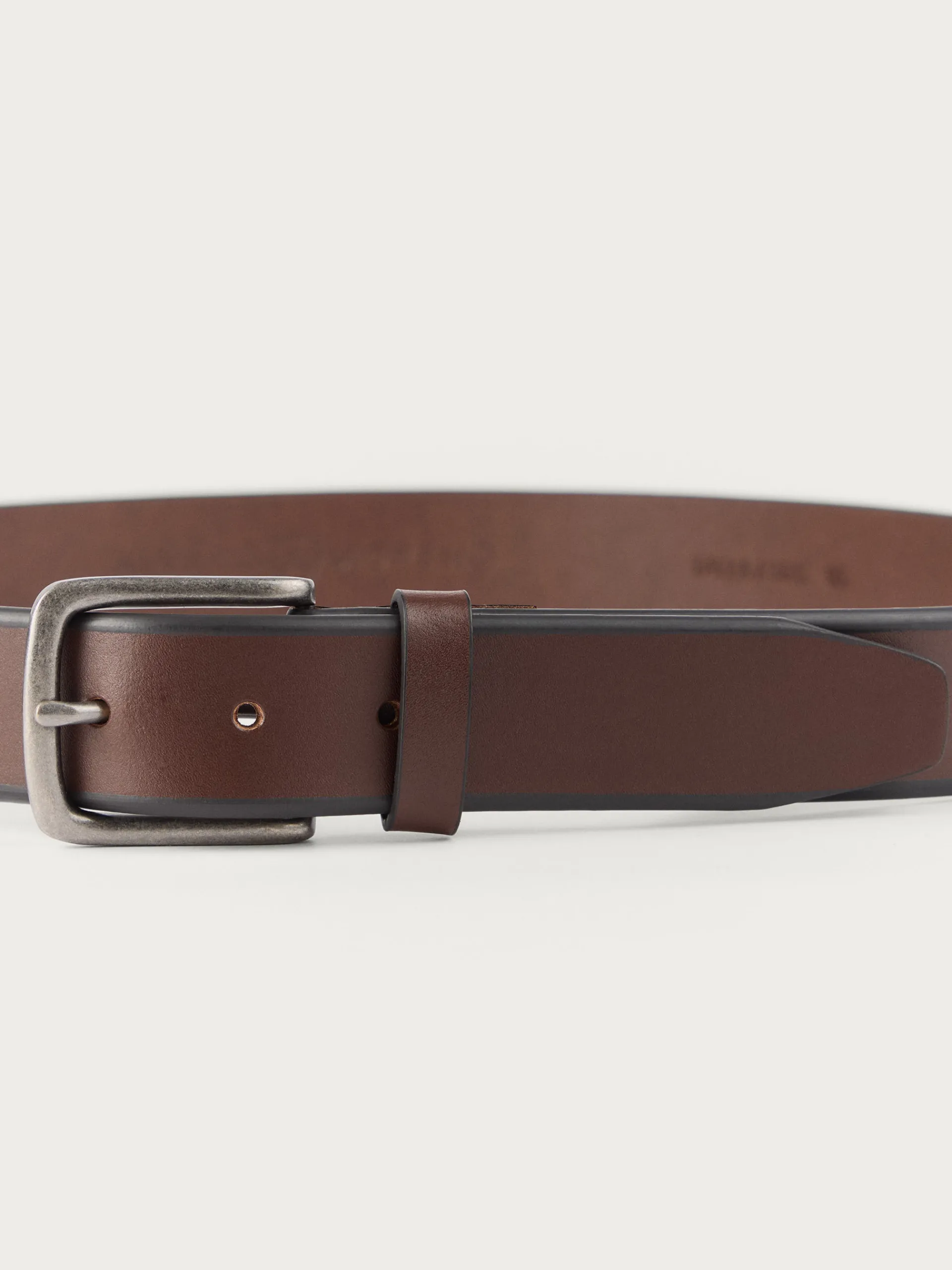 Cinturón confeccionado en piel con cierre central mediante hebilla metálica en color plata y pasador al tono del cinturón. Detalles de pespuntes a contraste.