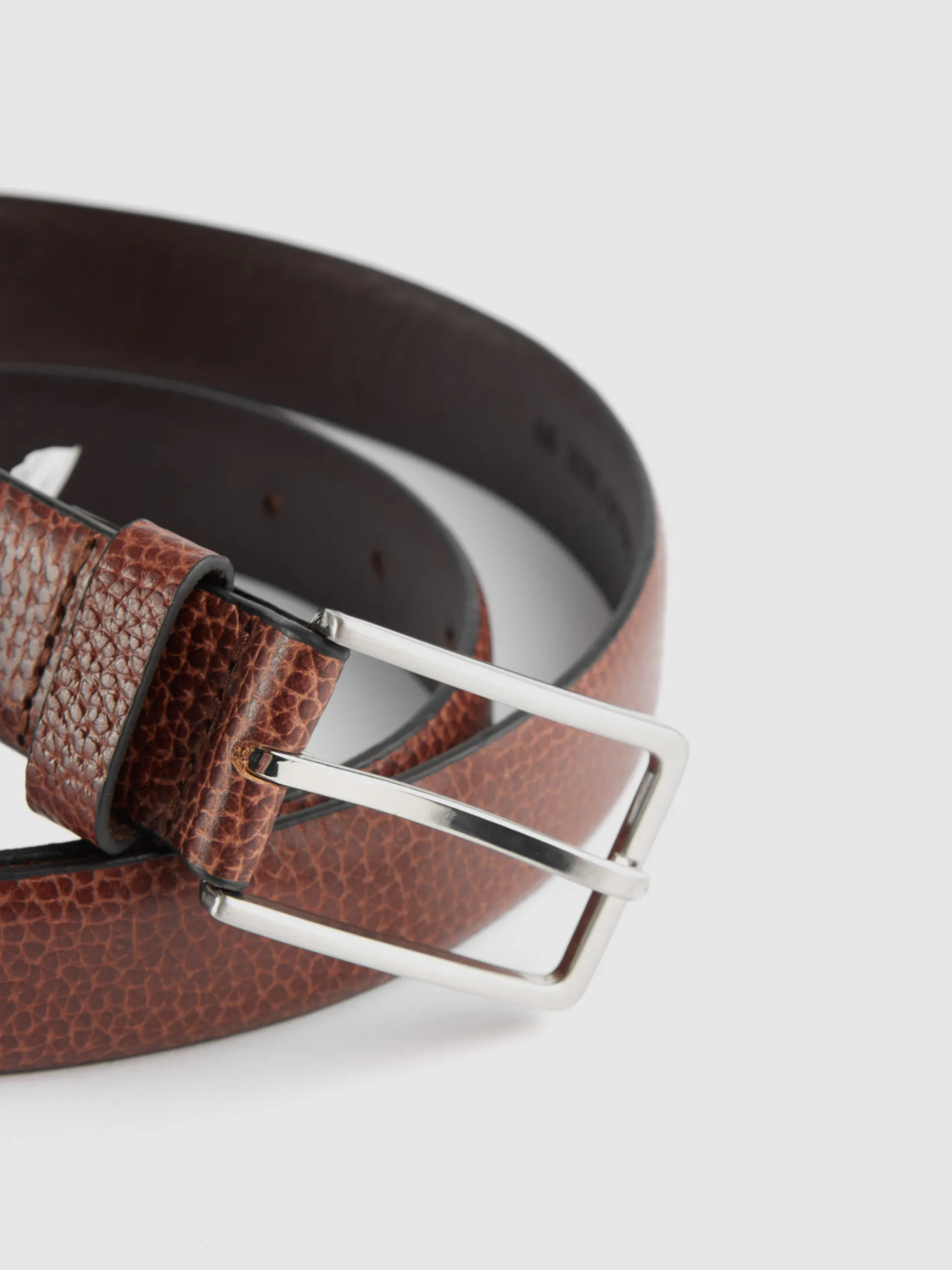 Cinturón confeccionado en piel con textura rugosa, cierre mediante hebilla metálica a contraste y pasador al tono. Detalles y pespuntes al tono.