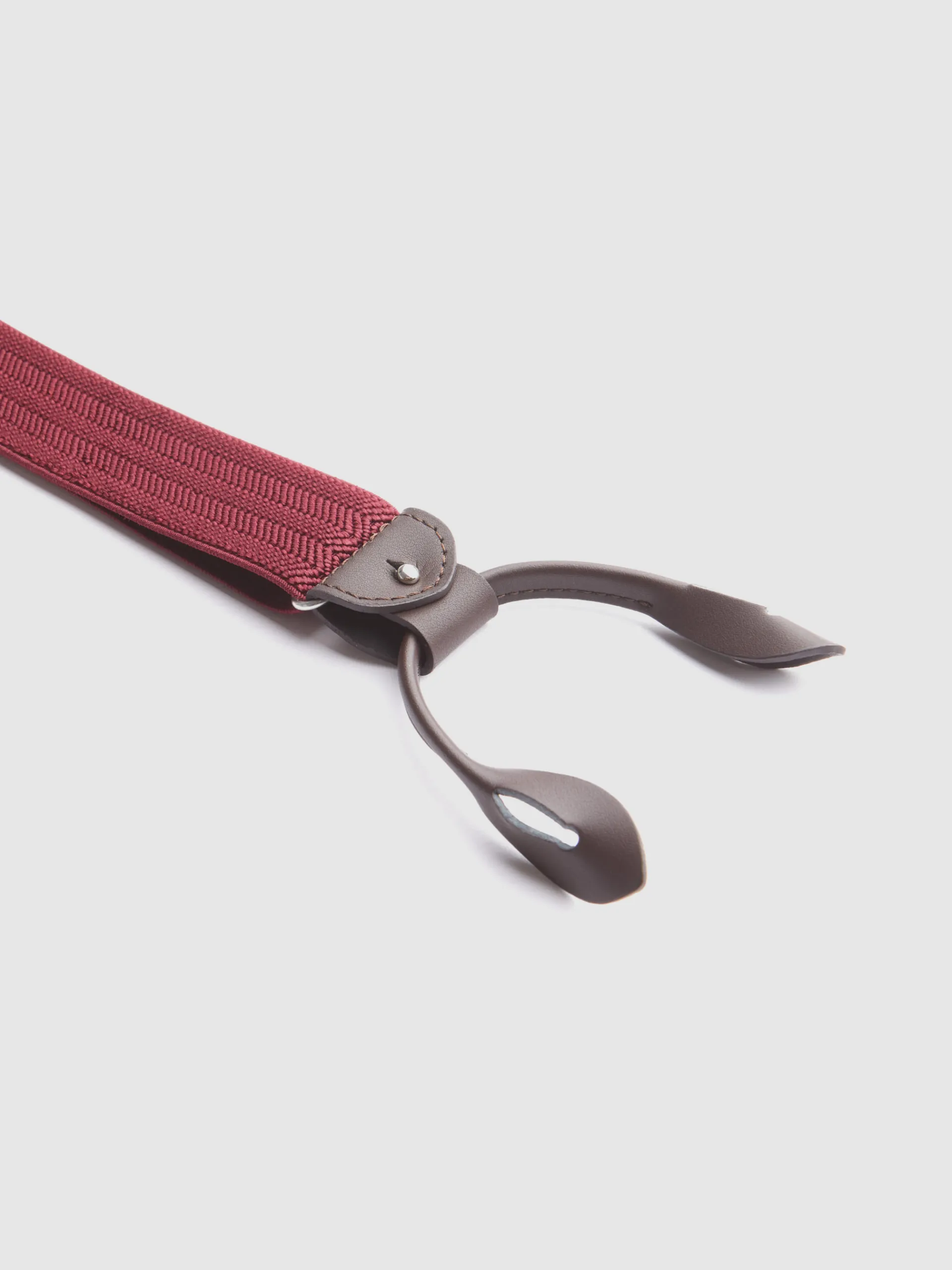 Tirantes elásticos con tejido de espiga y aplique de piel personalizado en la espalda. Terminación con sujeciones intercambiables mediante pinzas metálicas o latiguillos.