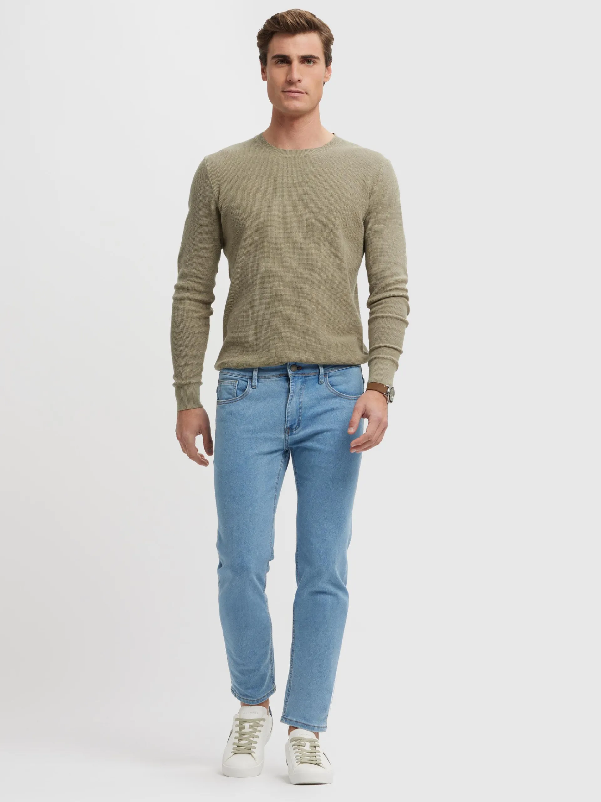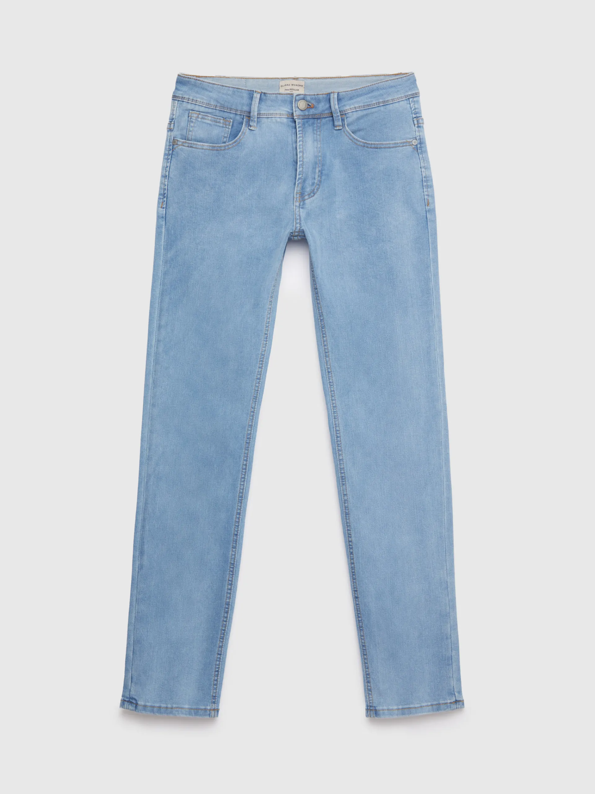 Pantalón denim de corte regular fit con cinco bolsillos y cierre central mediante botón y cremallera, pespuntes en col…