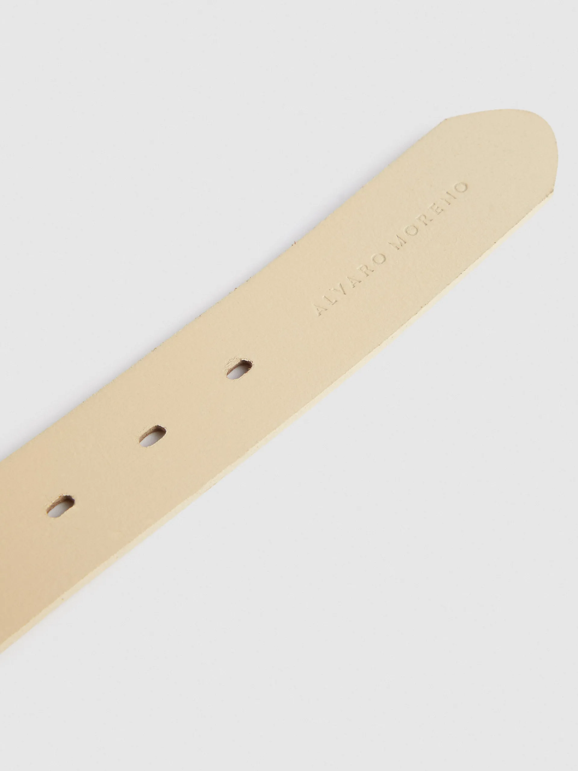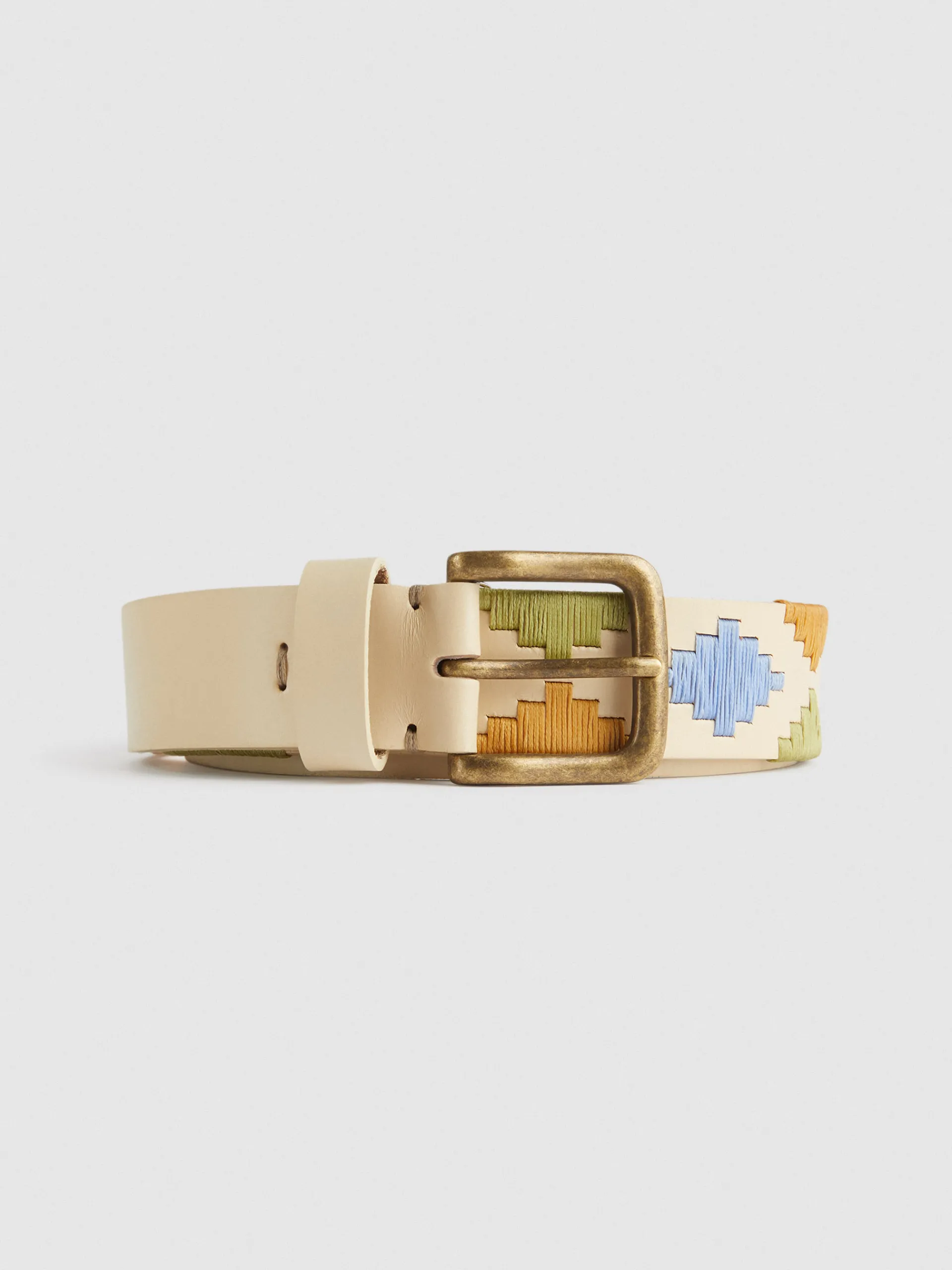 Cinturón con detalles personalizados y cierre central mediante hebilla metálica y pasador.