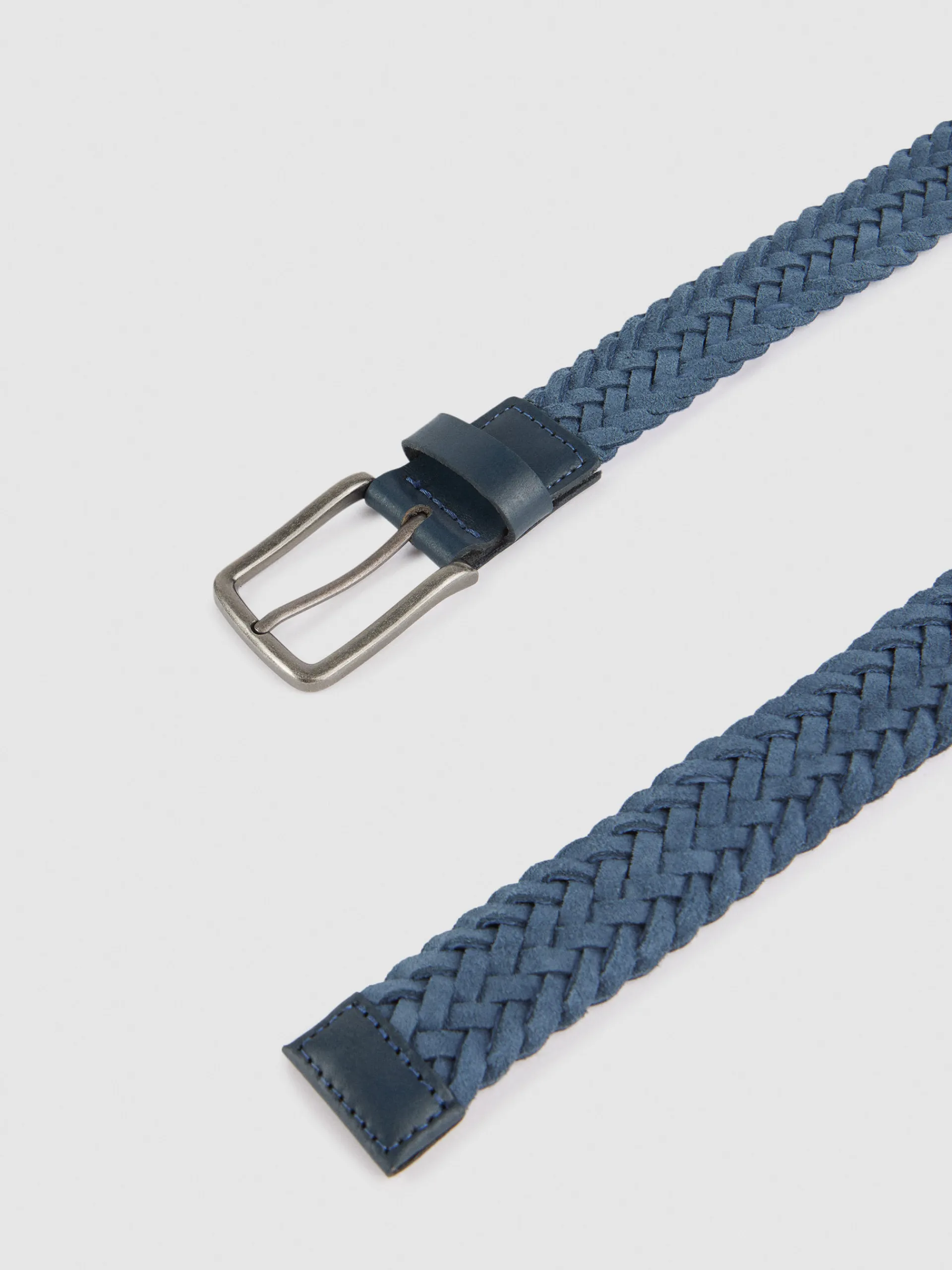 Cinturón de estilo trenzado confeccionado en cuero con cierre central mediante hebilla metálica y pasador al tono.