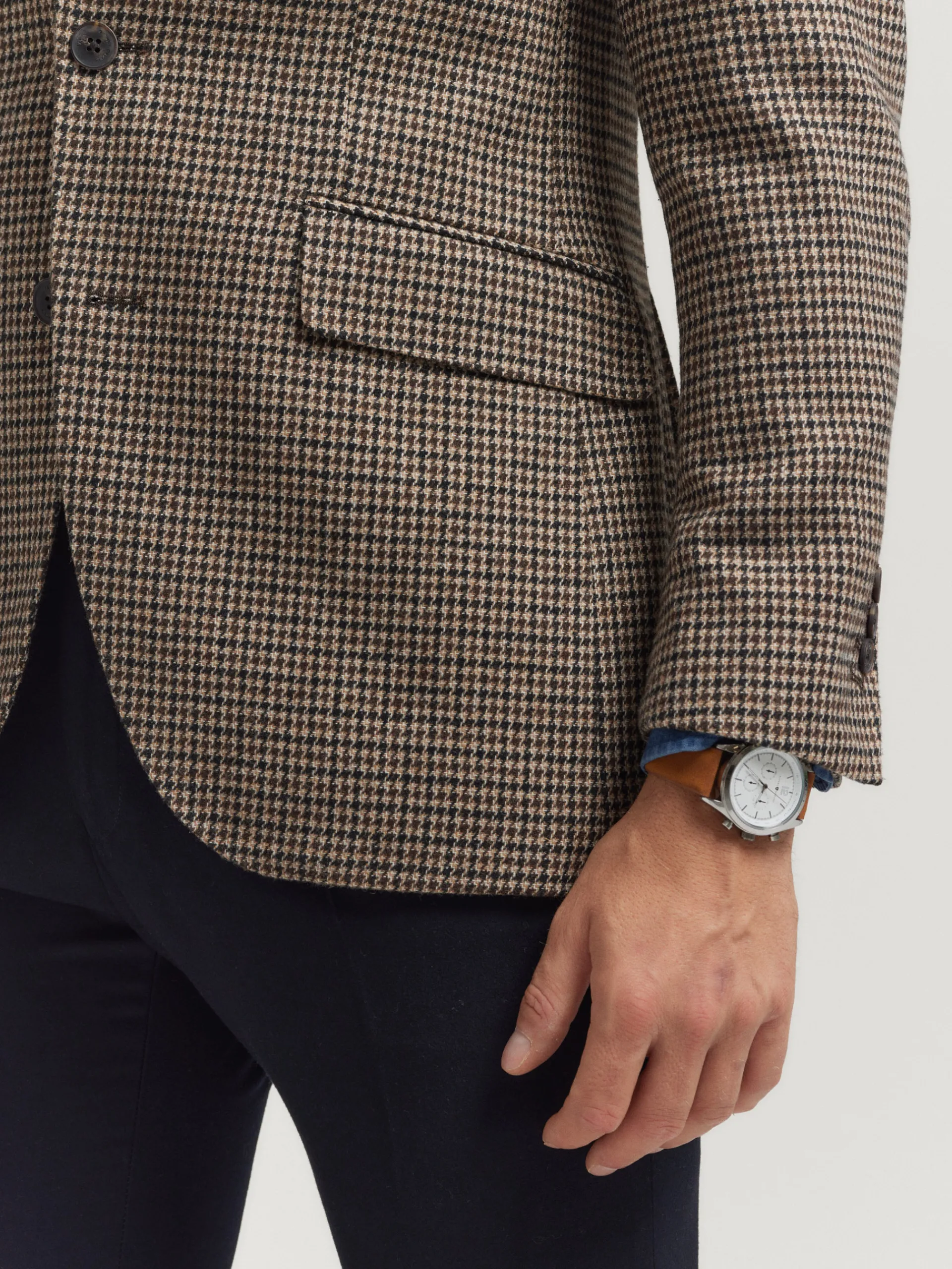 Americana confeccionada en tejido a cuadros de corte slim fit. Cuenta con cuello y solapa, cierre central simple mediant…