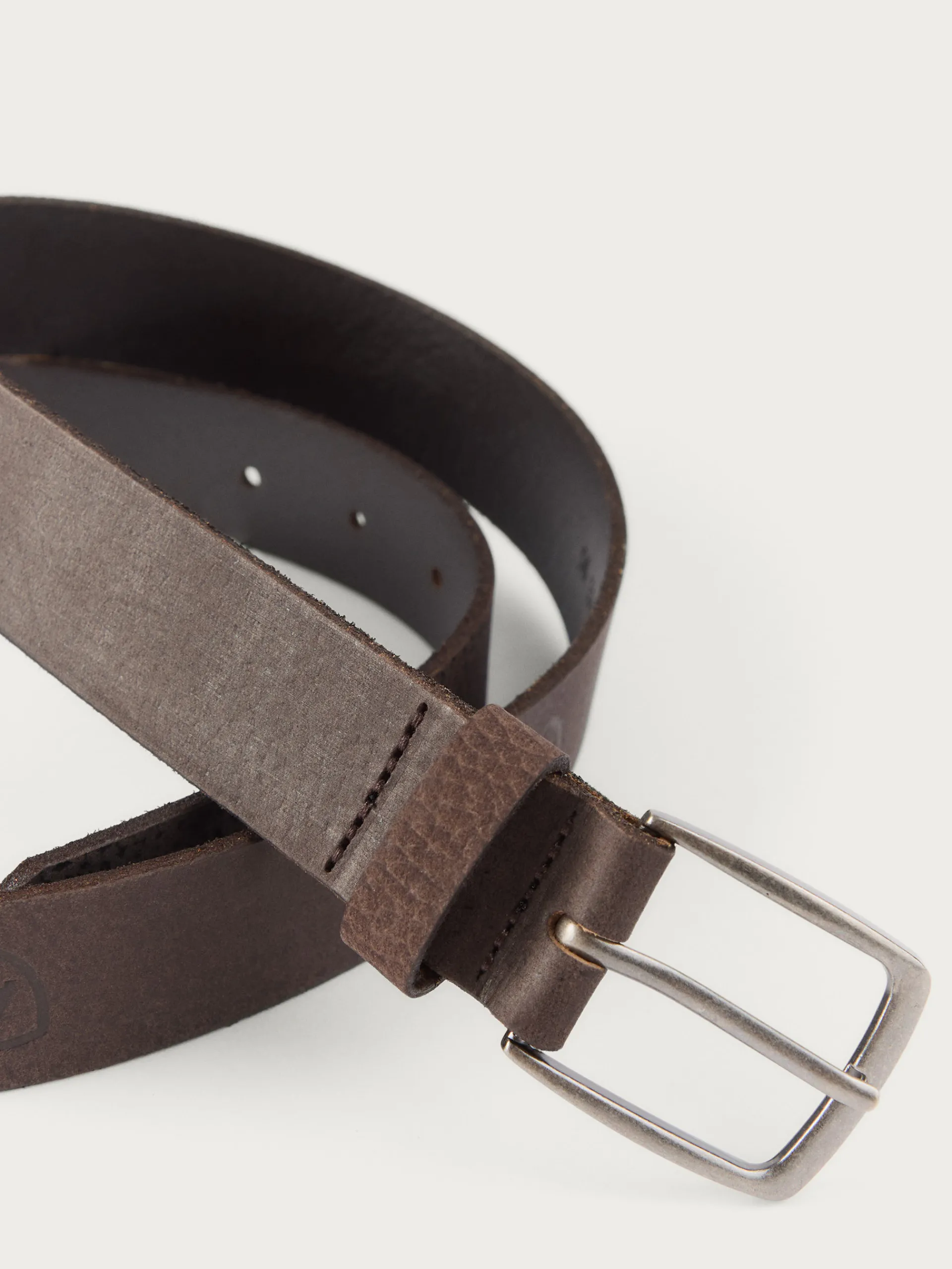 Cinturón confeccionado en piel con cierre central mediante hebilla metálica, pasador al tono y logo de la marca grabad…