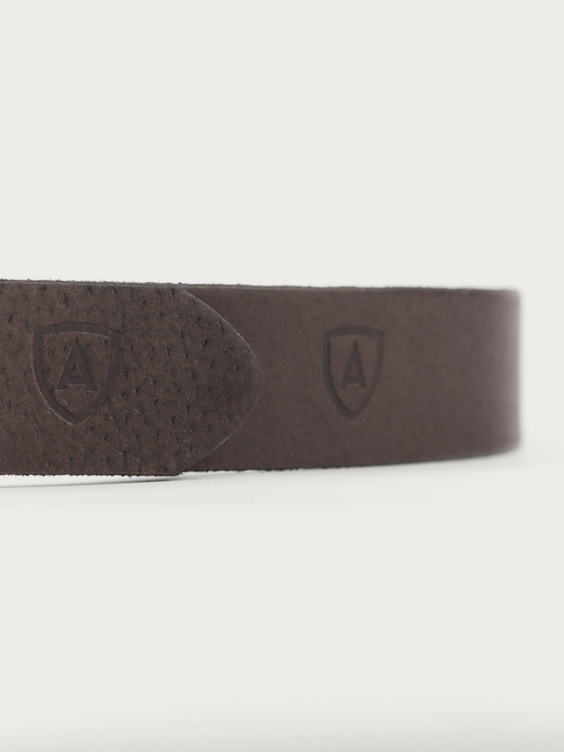 Cinturón confeccionado en piel con cierre central mediante hebilla metálica, pasador al tono y logo de la marca grabado al tono.