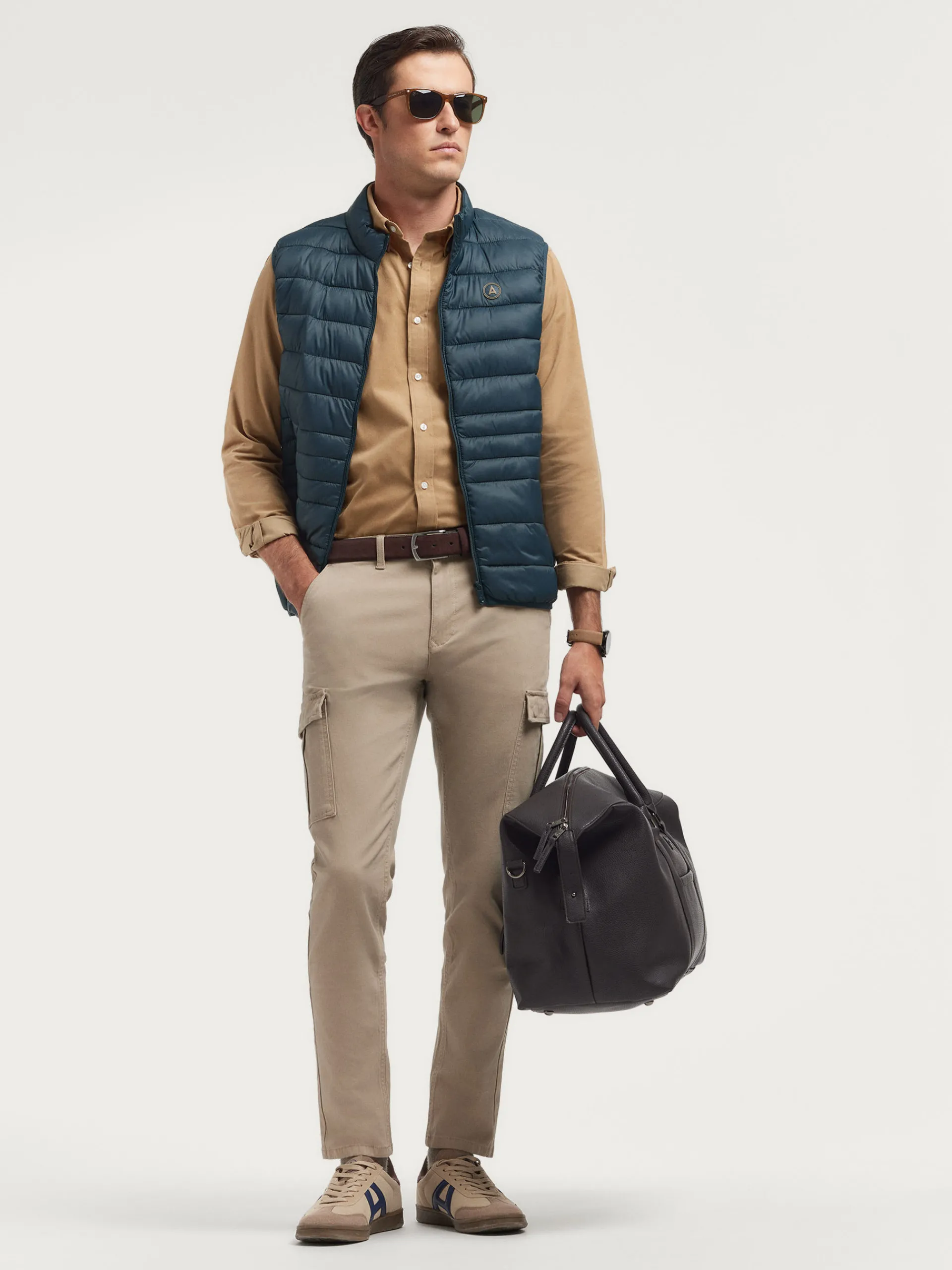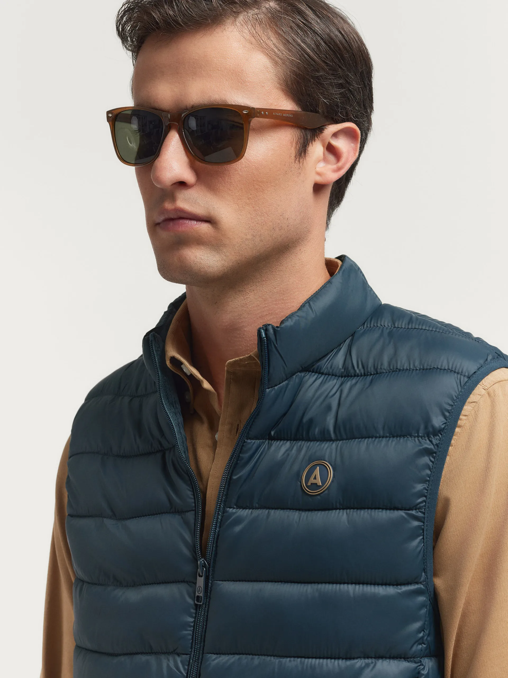 Chaleco acolchado con cuello subido. Dos bolsillo a la altura de la cintura, logo grabado en el frontal y sisa y cintura en punto elástico. Forro interior a contraste con bolsillos.