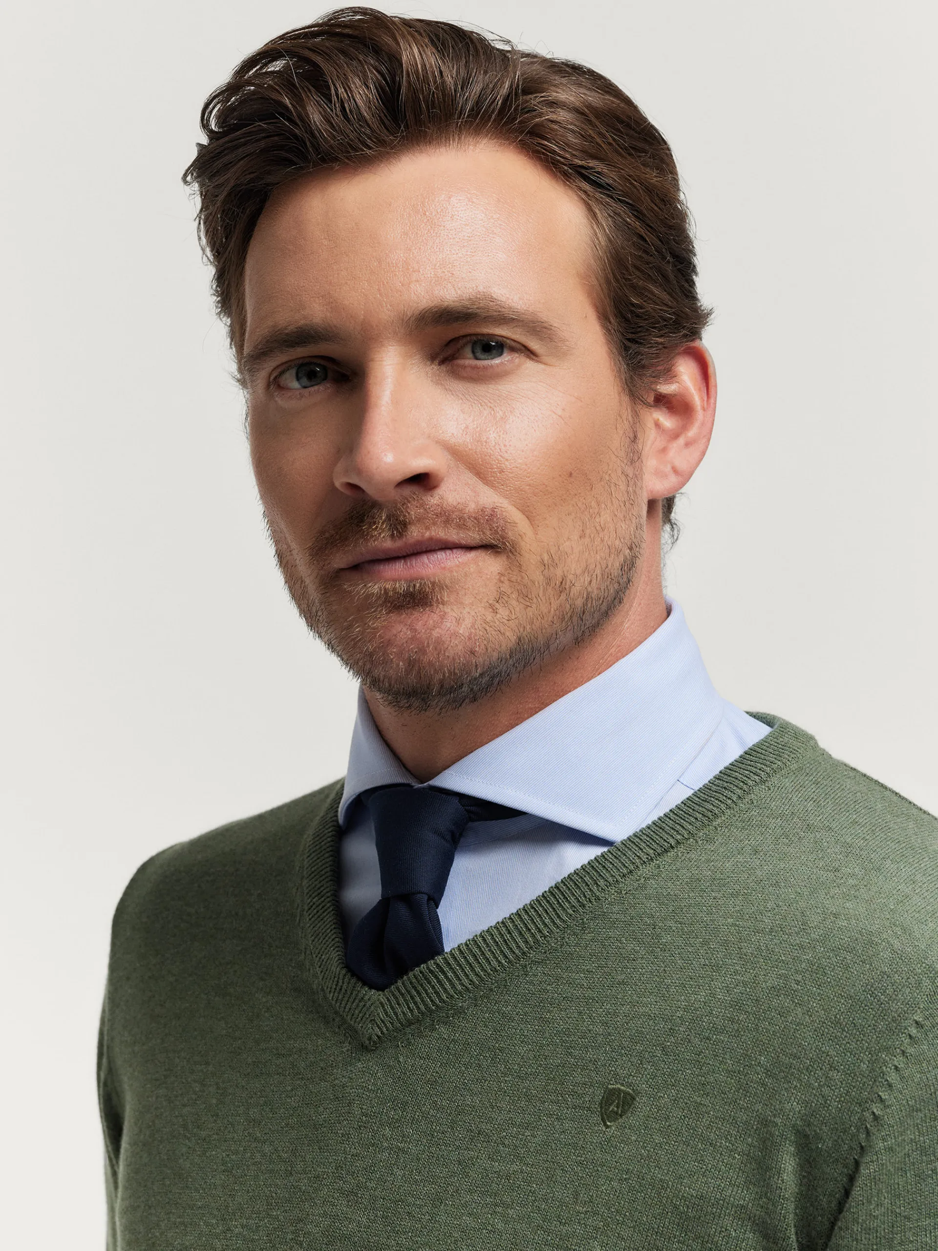 Jersey liso con cuello de pico, manga larga y logo de la marca grabado en el frontal al tono. Cuello, puños y bajo en acabado ribeteado. Corte regular fit.