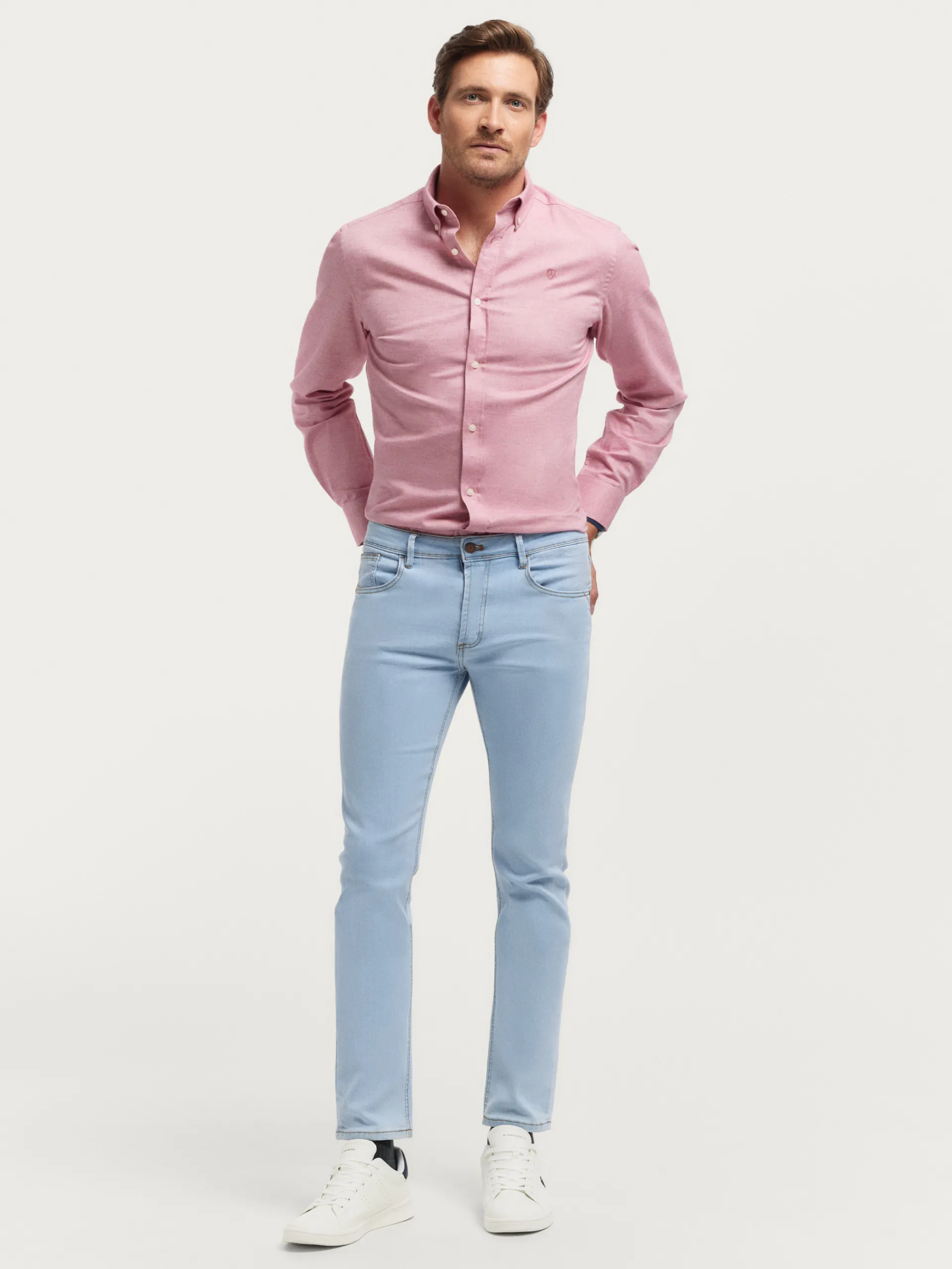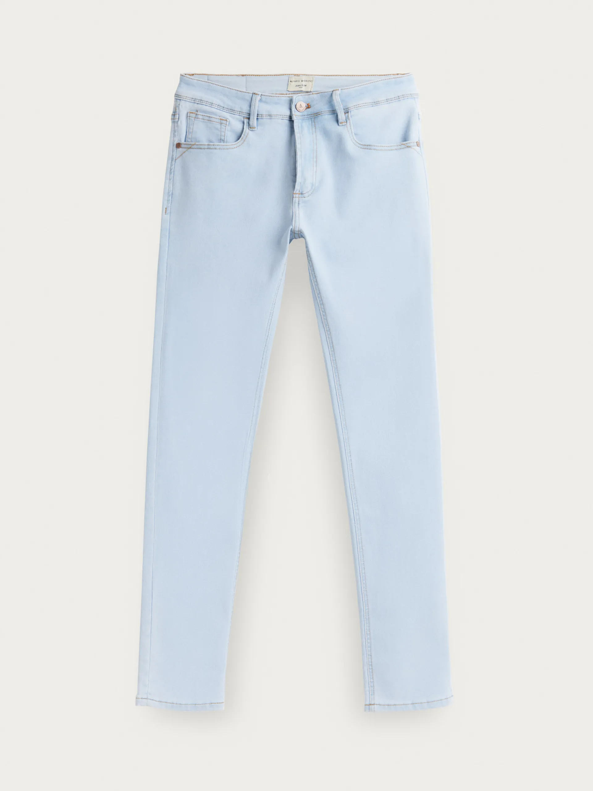 Pantalón denim de corte slim fit con cinco bolsillos y cierre central mediante botón y cremallera, pespuntes en color …
