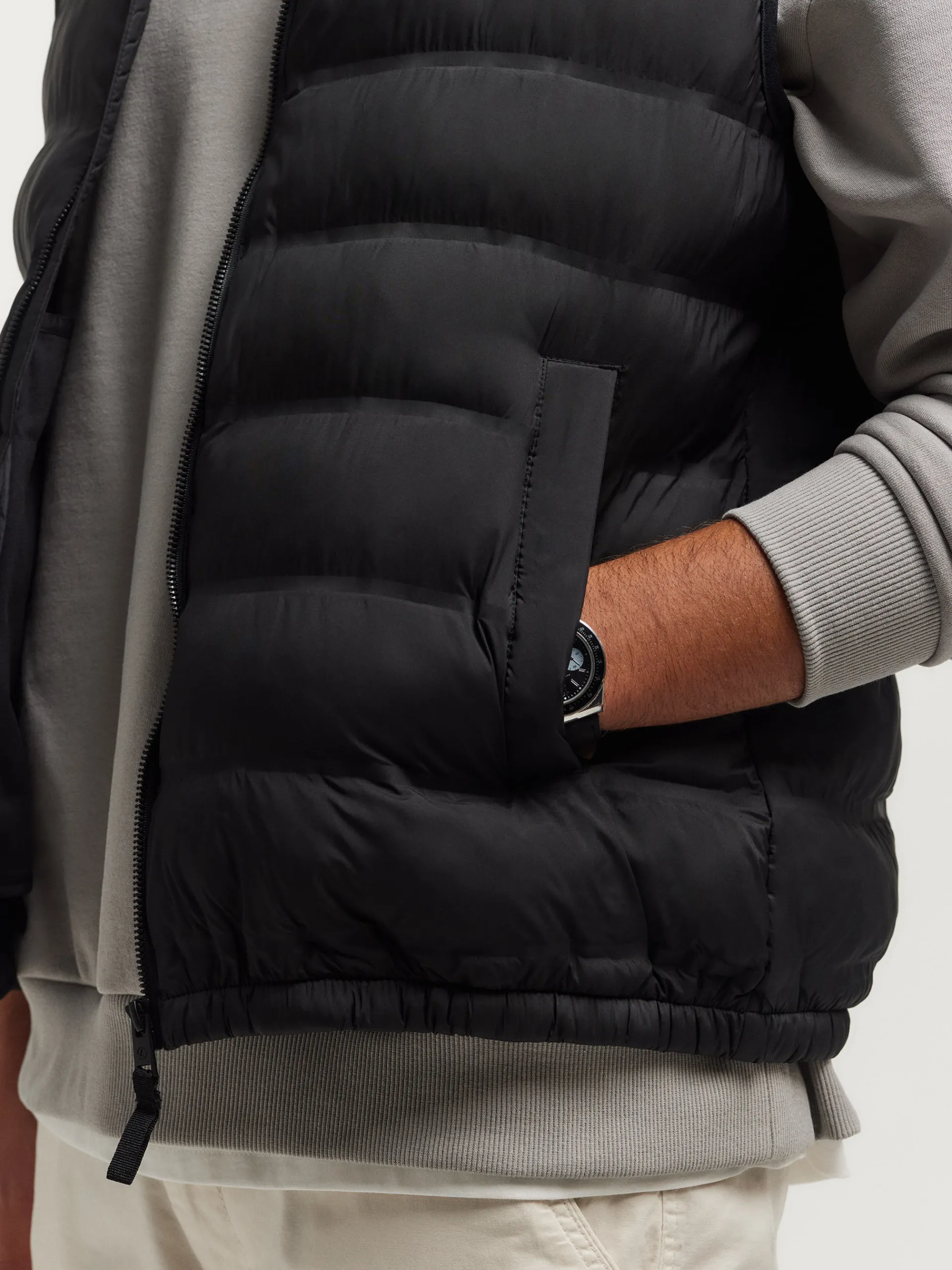 Chaleco acolchado con cuello subido y cierre central mediante cremallera, dos bolsillos a la altura de la cintura y logo de la marca grabado en el pecho al tono. Elástico en la sisa y cintura. Forro interior a contraste con bolsillos.