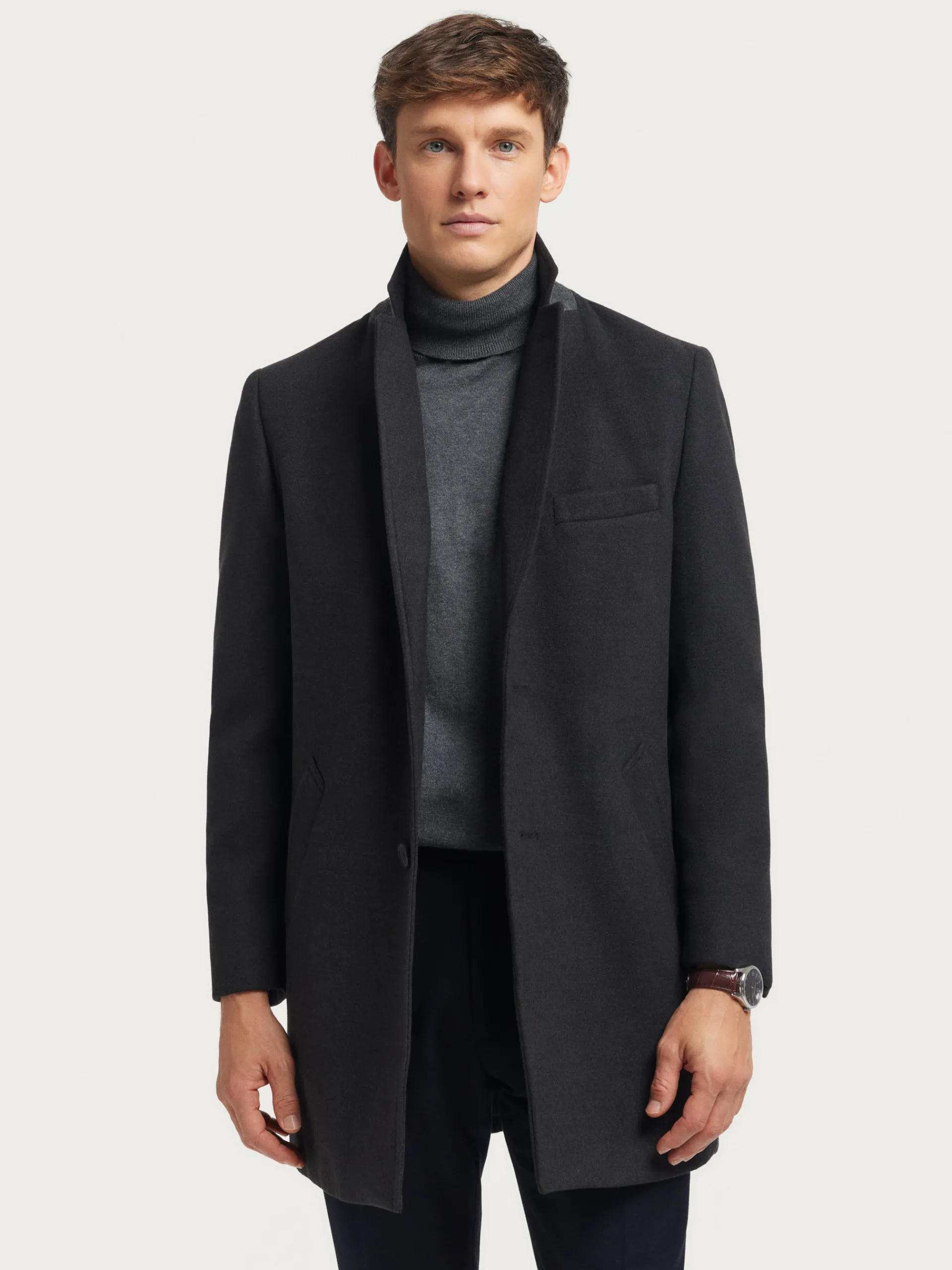Abrigo de paño liso con cuello y solapa. Cierre central mediante botones, manga larga con botones en su terminación y …
