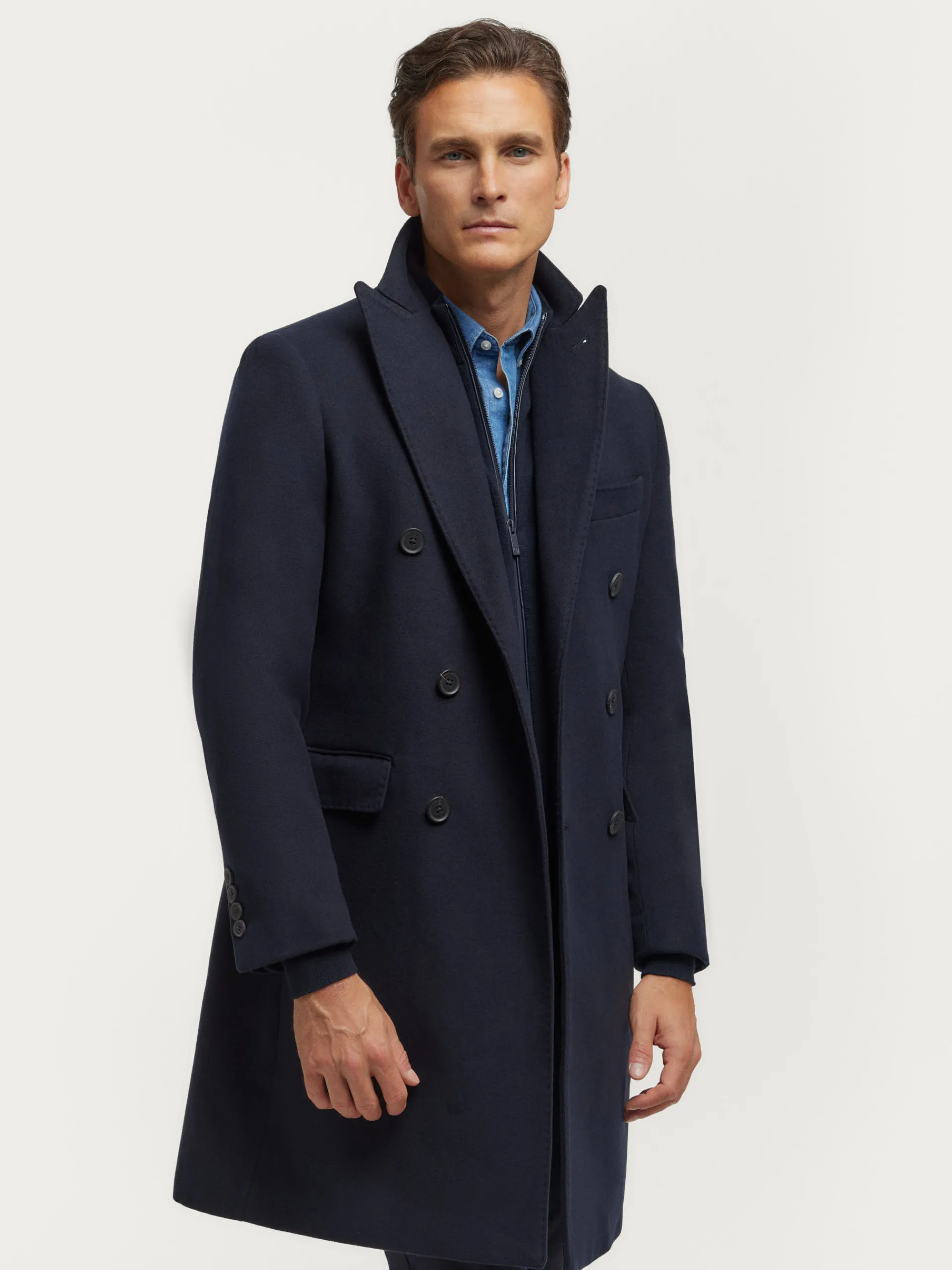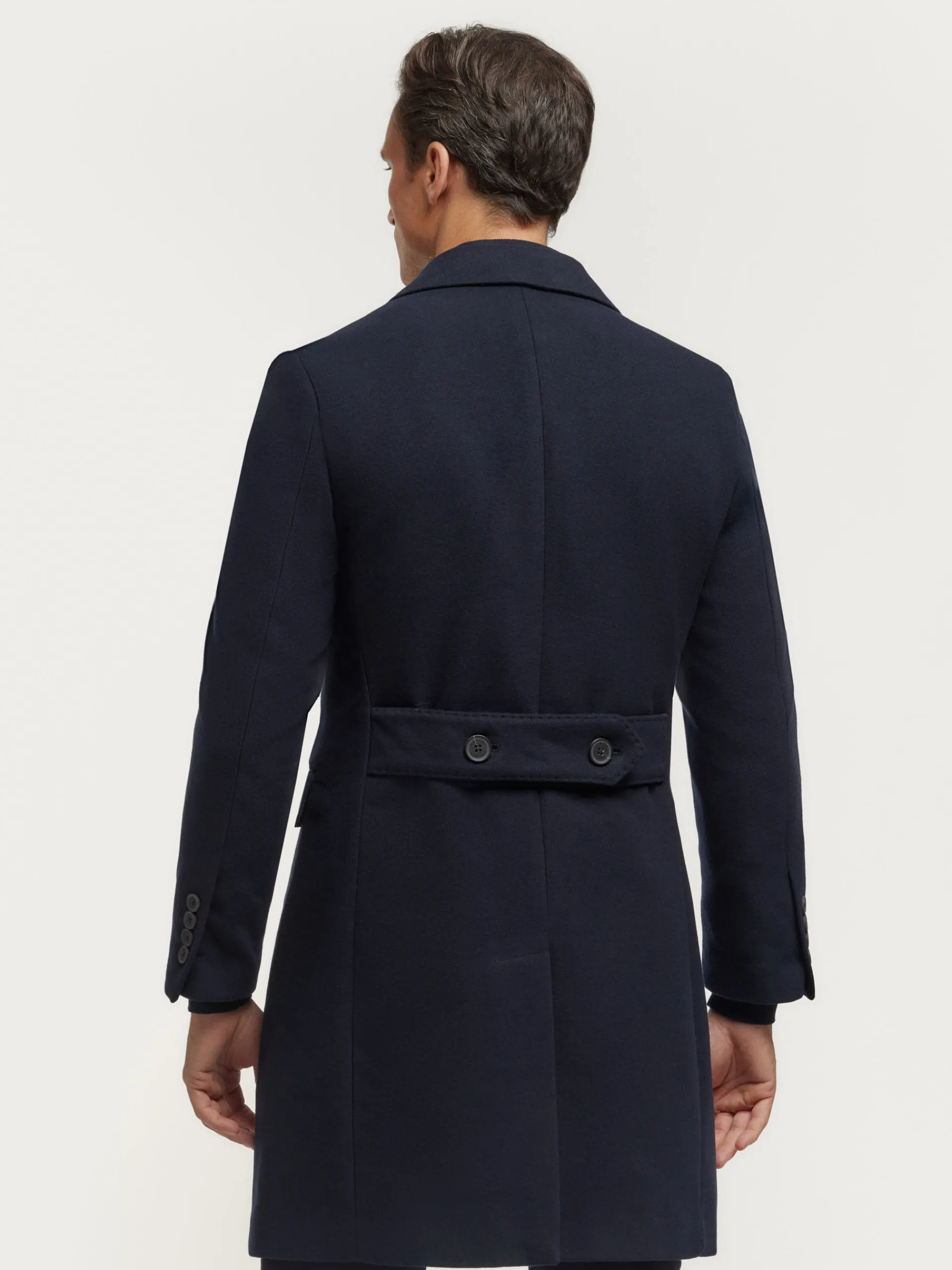 Abrigo largo que cuenta con cuello y solapa, cierre central cruzado, ajuste martingala en la cintura-espalda, bolsillo de ojal en el pecho y dos bolsillos de parche en la cintura. Manga con terminación de botones decorativos. Abertura en el bajo. Forrado en su interior con dos bolsillos.